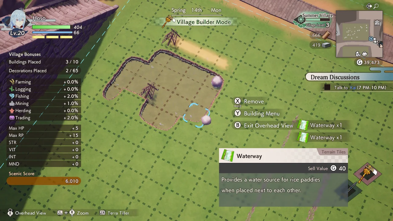 Guardians of Azuma makes this process delightfully easy thanks to numerous features within its builder mode. While it’s understandable to wait until your crops are ready to harvest before re-organizing your fields, removing a field or even a tree refunds you the appropriate seeds. Just find a new spot for them and drop the seeds back into the earth, and they will start their growth process over. However, if you keep your trees or large landmarks like buildings within the same zone, you can simply “move” the object, keeping trees at the same growth stage and villagers assigned to their stores. If you absolutely must pocket a building to transport elsewhere, you must reassign a shopkeeper in the villager menu once you’re done. But this minor inconvenience can’t dream of detracting from this system’s flexibility, offering lots of room for personal expression as players design their villages. But none of these are the greatest feature of builder mode: that honor goes to the top-down view.