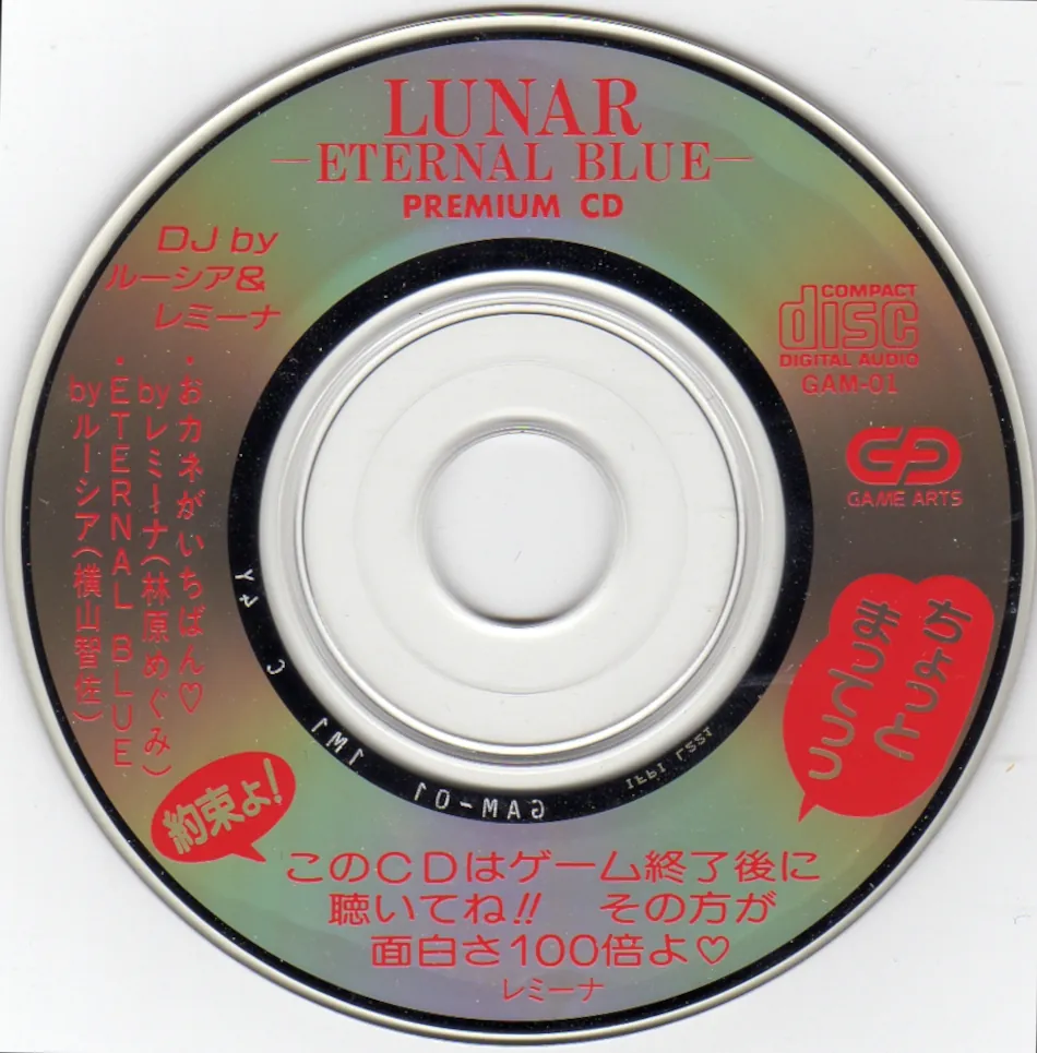 The Eternal Blue “Premium CD” was a bonus 8cm CD that came with the Japanese version of Eternal Blue for Sega’s “Mega CD” console (just “Sega CD” in America). The bonus album contained five tracks: three short and cutesy drama tracks, and two vocal tracks. Were it not for Lunar Songs 2, Lemina’s “Money ga Ichiban” (or “Money is Number One”) would be exclusive to this album. However, the only things found only on this CD are the drama tracks.