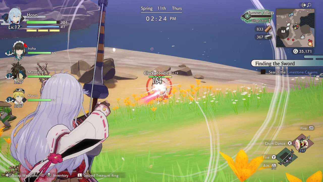 Gaining experience with your weapons is as simple as using them in battle, and combat is slightly better than in past Rune Factory titles. It’s still mostly picking the weapon with your favorite basic combo and then alternating between button mashing to deal damage and dodging to avoid taking damage. But you can swap to a secondary weapon on the fly, which doesn’t sound too special until you factor in the new bow weapons. You can use bows in Guardians of Azuma in the usual button-mash-combo manner, but you can also take aim for more precise and powerful shots. You can even land headshots or hit other enemy weak points to do more damage.