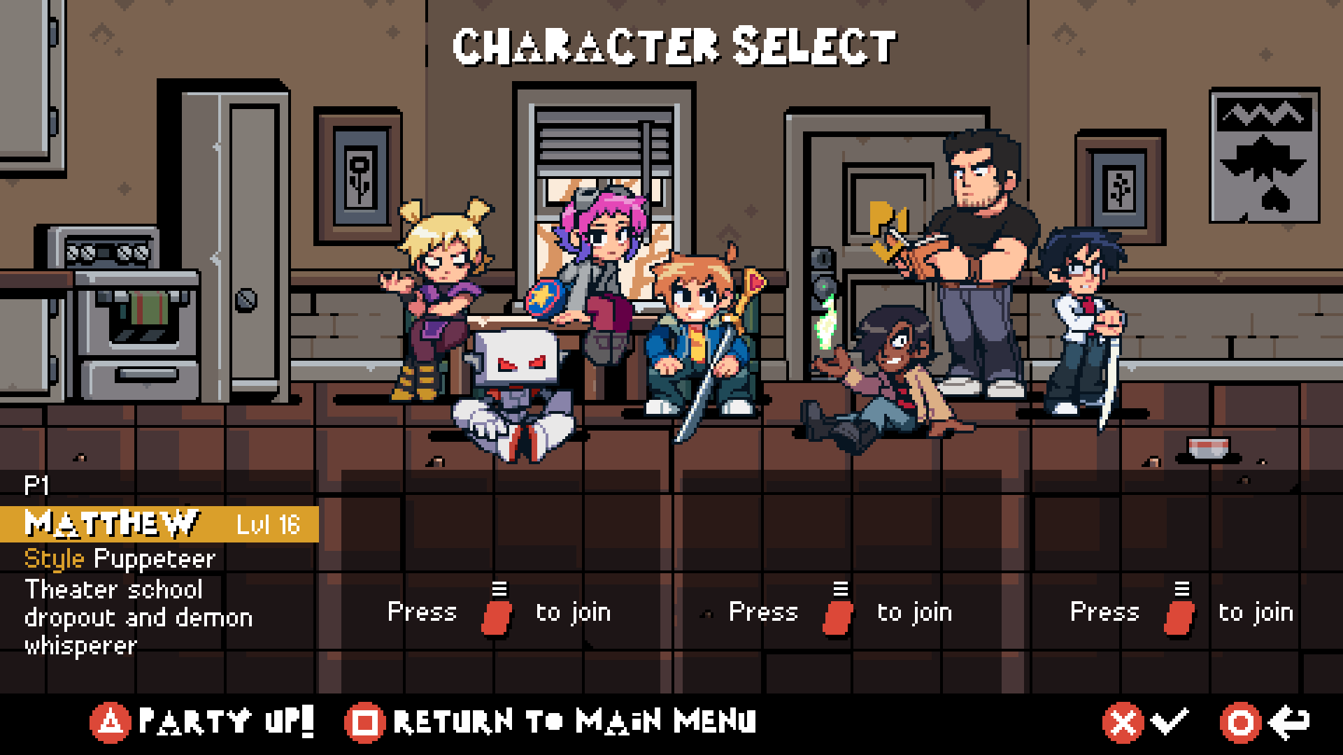 “Yeah, yeah, references. But how’s the punching?” As expected from Tribute Game’s gameography, the combat is another win. Light, heavy, grab, and special attacks are here, as are equipable assist attacks from plenty of characters who didn’t make the playable cut. What’s more, each of the seven playable characters feels unique. I appreciate that beyond Scott and Ramona, the characters from the last Scott Pilgrim beat ‘em up, now the aforementioned friends in need of rescue, are replaced with a new roster (of past villains!): Roxie the ninja, Matthew Patel the puppeteer, wrestler (and movie star) Lucas Lee, zoner Robot-01, and, surprisingly, series antagonist Gideon Graves, here a rushdown “pressurer.”