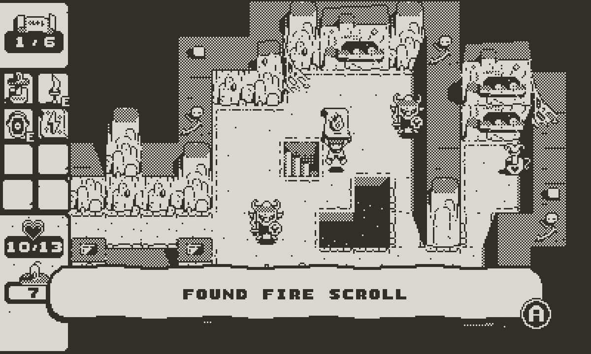 Visually, Under the Castle is one of the most intricately detailed games on the Playdate. The castle and dungeons are littered with little eye-catching details, including a handful of inspired later-game enemy designs. At times the environments are so intricate that they become a bit difficult to parse when the Playdate’s display isn’t well lit, though the developers did a good job making sure the play space is clutter-free. This problem can also be easily remedied through Playdate’s screen mirroring app available free on computers (the details really shine on a bigger screen, too).